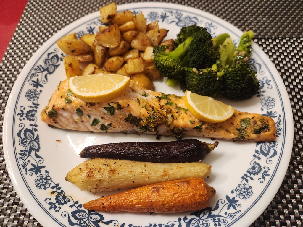 Served up with oregano roasted potatoes, garlicky broccoli and multicolored baked carrots. Squeeze the lemons before eating for extra lemony flavor.