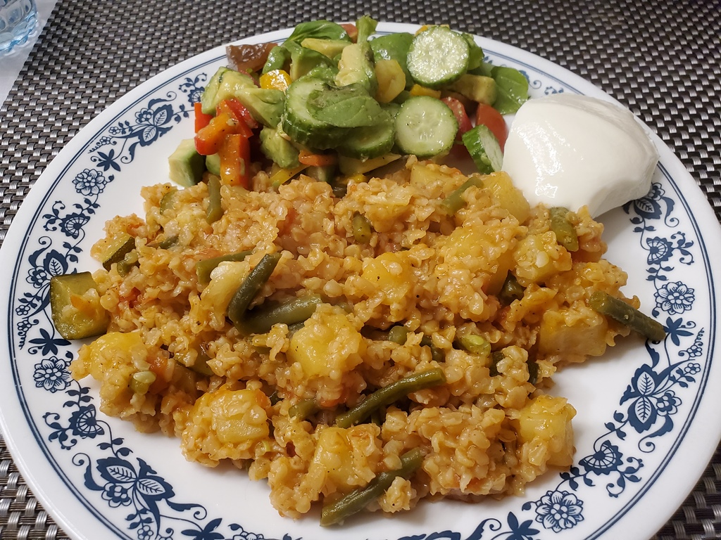 Zucchini missing, but not missed when this and a second helping was ingested by bob, with generous replenishing of the plain yogurt side. Arugula salad for color.
