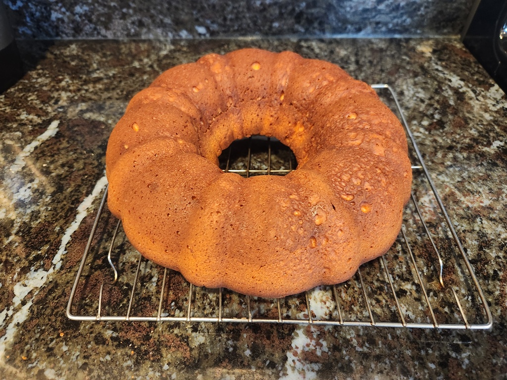 So Anii added an extra cup of flour to correspond to the correct recipe quantity but bob found the first version with less flour actually more moist. Isgouhi prefers the second version. Everybody has different tastes. This is the bundt pan outcome.